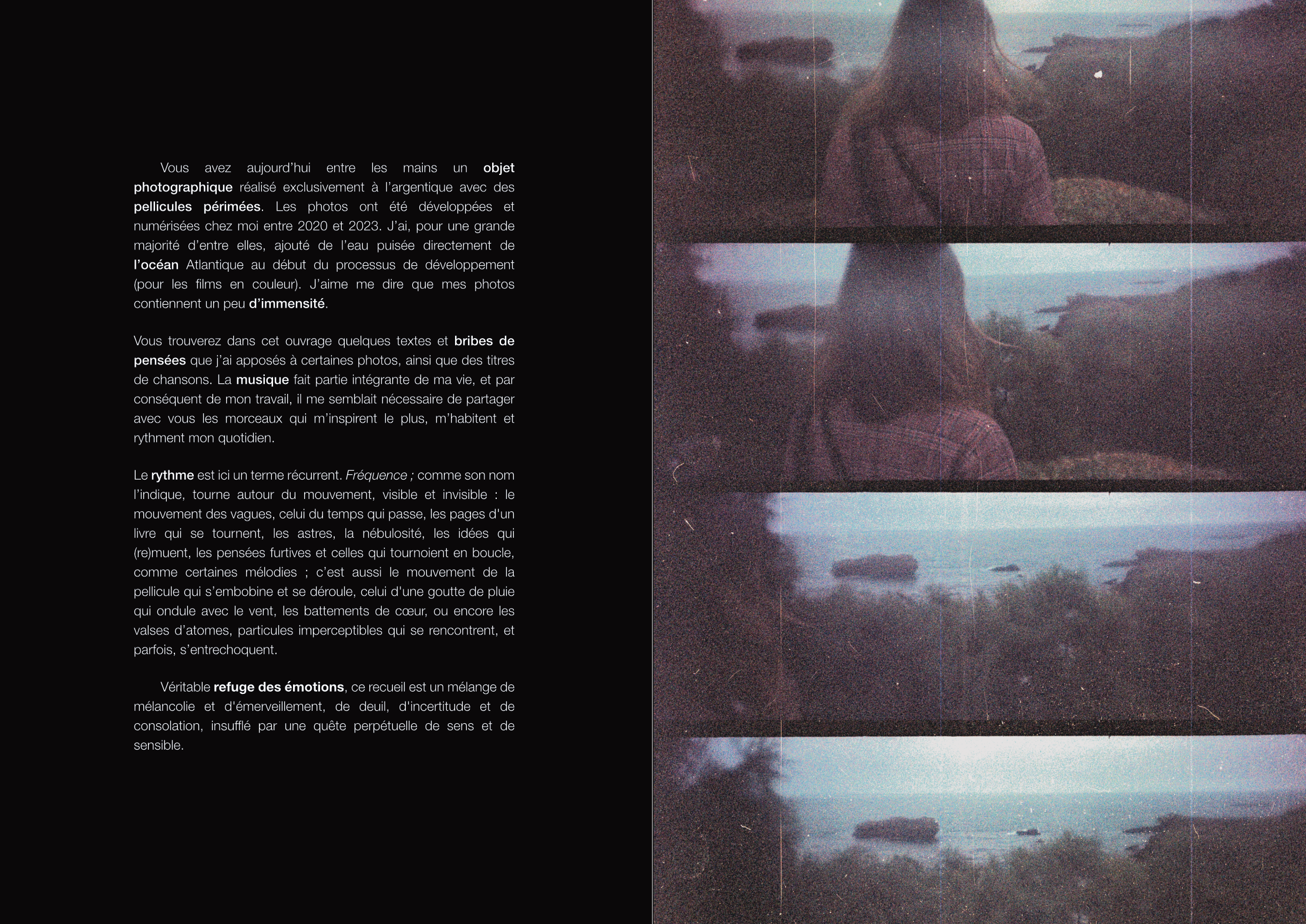 Le projet Fréquence ; est un livre photo réalisé avec des pellicules périmées, des photos prises sur plusieurs années, accompagnées de quelques pensées. Le projet tourne autour du Mouvement visible et invisible, et de l’Émotion dans son intégralité.